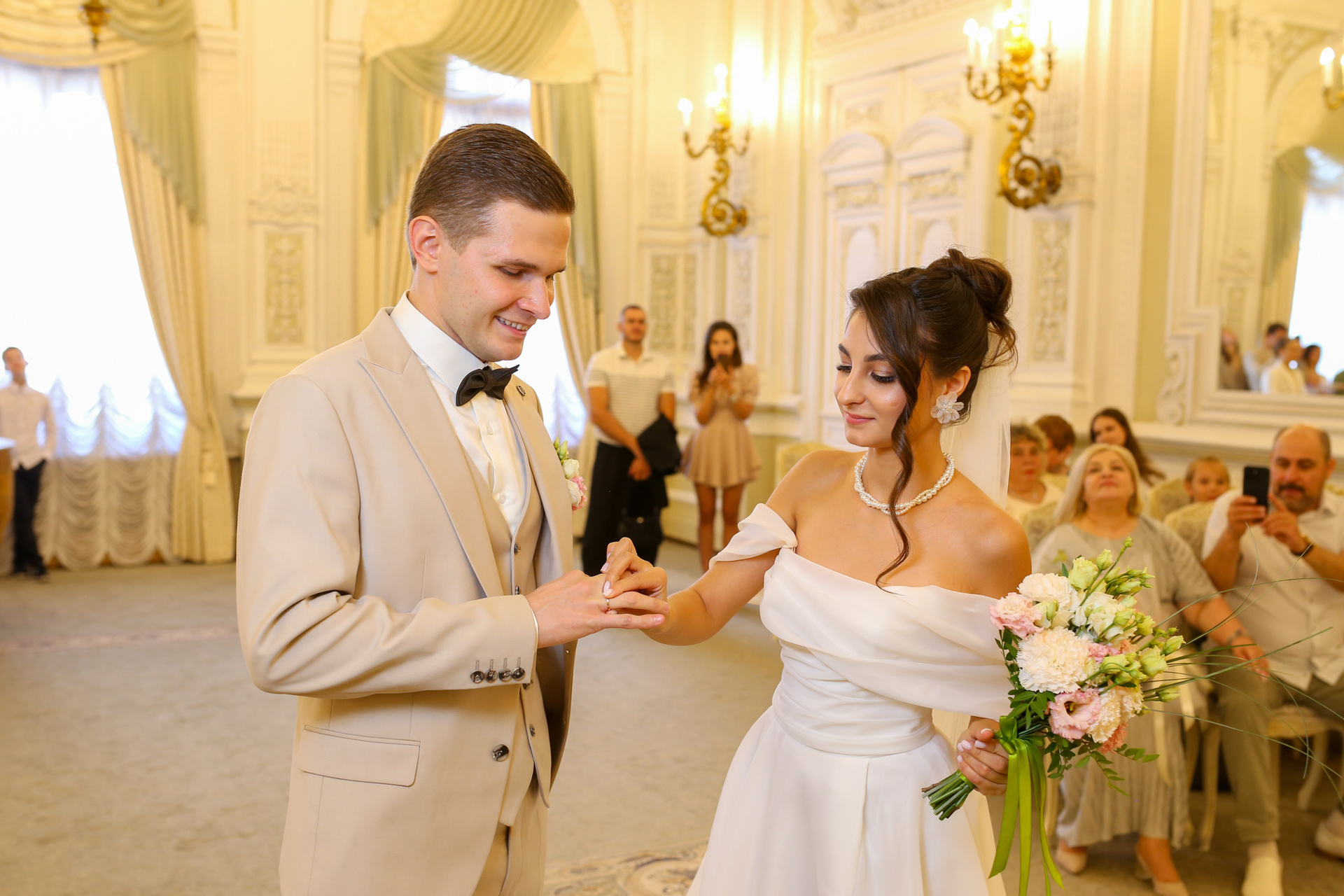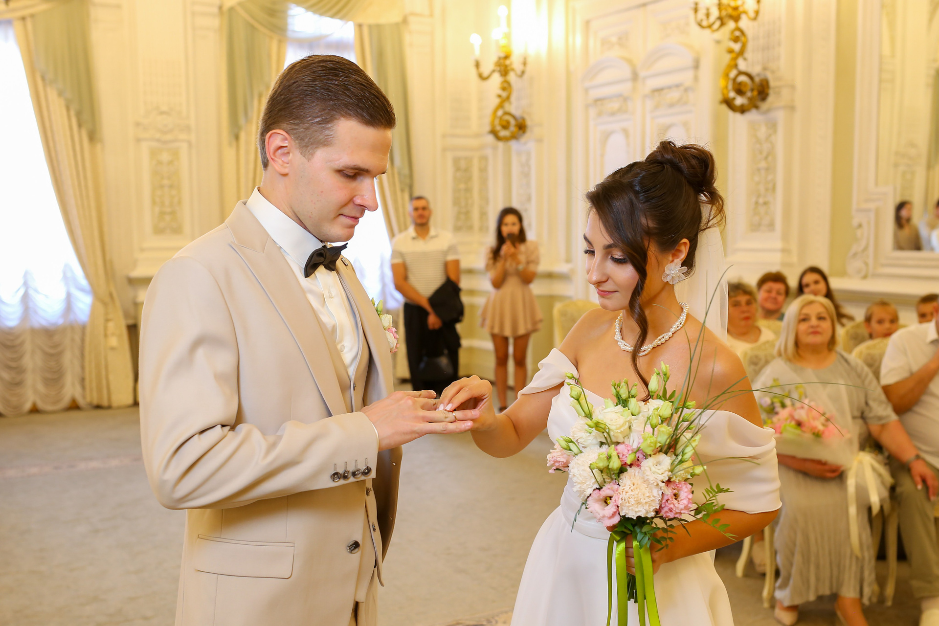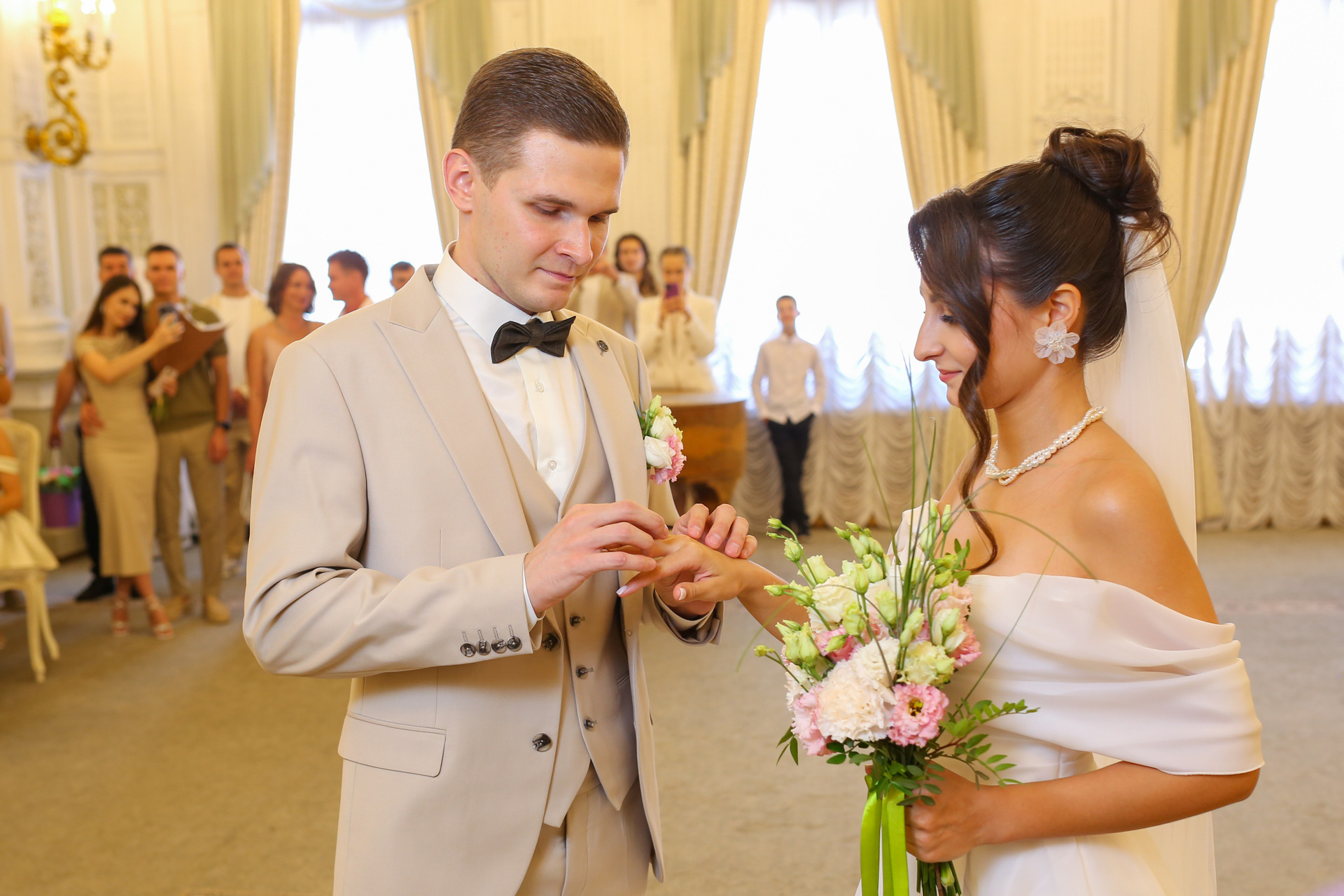 Классические кадры, запечатлевшие торжественный момент во Дворце бракосочетания. Снимки передают искренние эмоции, волнение и счастье молодоженов, превращая мгновения в вечную историю любви.
